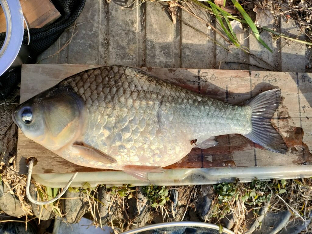 去年は体調の加減もあって、釣行できなかった期間が結構あった事もあり、尺半は一枚も出なかった。他のヘラ師も出してない。ほとんどが30センチ代で、40センチをこえると大物と言われていたくらいだ。そんな中、年明け早々の一枚である。久しぶりの尺半で、タモに収めたとき化け物のように見えた。引きの重さも格別である。
